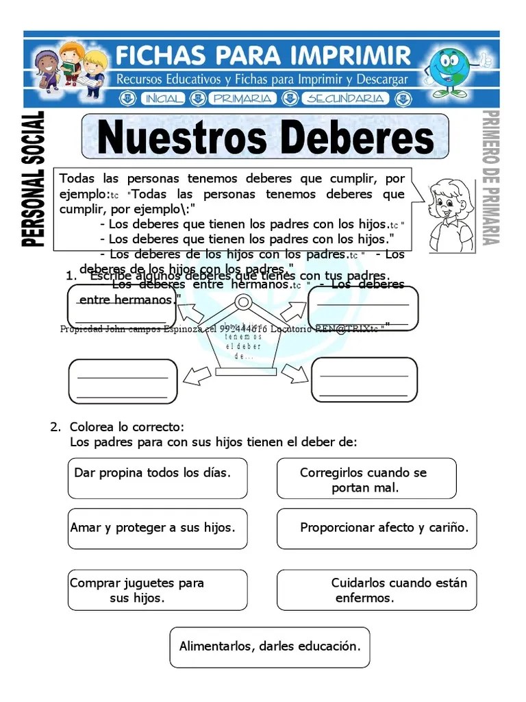 A continuación podrás decargarte o imprimir todos los deberes y recursos educativos para niños de primaria. Una de las obligaciones más importantes que establece la legislación general en materia de niñas, niños y adolescentes es la relativa a su participación . Deberes de los niños y adolescentes.